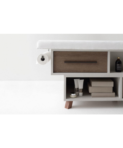 Массажная кушетка "The Wall" - оборудована двумя выдвижными ящиками, выдвижной полкой для косметического оборудования, экспозиционными отсеками для продуктов, большим отсеком для оборудования. Фронтальные ящики оснащены алюминиевыми ручками, отделка свинцово-черная. Регулируемая спинка. Оснащена держателем рулона и деревянными ножками.